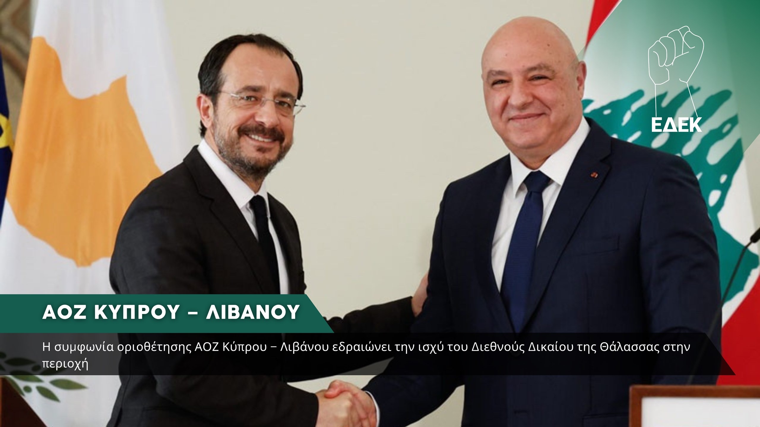 Η ΕΔΕΚ εκφράζει την ικανοποίηση της για την υπογραφή της Συμφωνίας Οριοθέτησης της Αποκλειστικής Οικονομικής Ζώνης μεταξύ Κυπριακής Δημοκρατίας και Λιβάνου και για τη συμφωνία διερεύνησης της ηλεκτρικής διασύνδεσης Κύπρου-Λιβάνου.