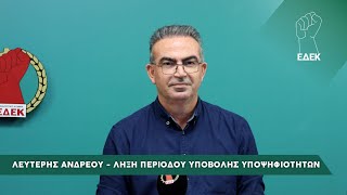 Μετά την 1 μ.μ., οπότε και έληξε η προθεσμία για την υποβολή υποψηφιοτήτων για τη θέση του Προέδρου της ΕΔΕΚ, ο Γενικός Γραμματέας της Κεντρικής Επιτροπής της ΕΔΕΚ, Λευτέρης Ανδρέου προέβη στην εξής δήλωση: