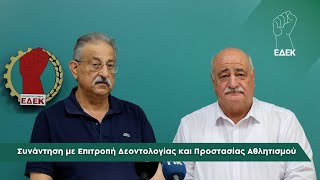 «Έχουμε τη χαρά να φιλοξενούμε σήμερα την Επιτροπή Δεοντολογίας και Προστασίας του Αθλητισμού και θέλω να ευχαριστήσω τον κύριο Ευθύμιο Ευθυμίου για την ενημέρωση την οποία μας έκανε σχετικά με το έργο το οποίο επιτελεί η Επιτροπή. Η ΕΔΕΚ έχει μία σειρά προτάσεων για ενίσχυση της δεοντολογίας του Κυπριακού αθλητισμού. Έχουμε παρουσιάσει τις θέσεις μας, τις εισηγήσεις μας, έχουμε ακούσει για το έργο, το οποίο είναι πολύ σημαντικό και θεωρούμε ότι το έργο το οποίο επιτελείται συμβάλλει θετικά στην αποκατάσταση των όποιων προβλημάτων στον τομέα του αθλητισμού. Ευχαριστώ ακόμα μια φορά για την ενημέρωση και θα είμαστε σε συνεχή επικοινωνία.».