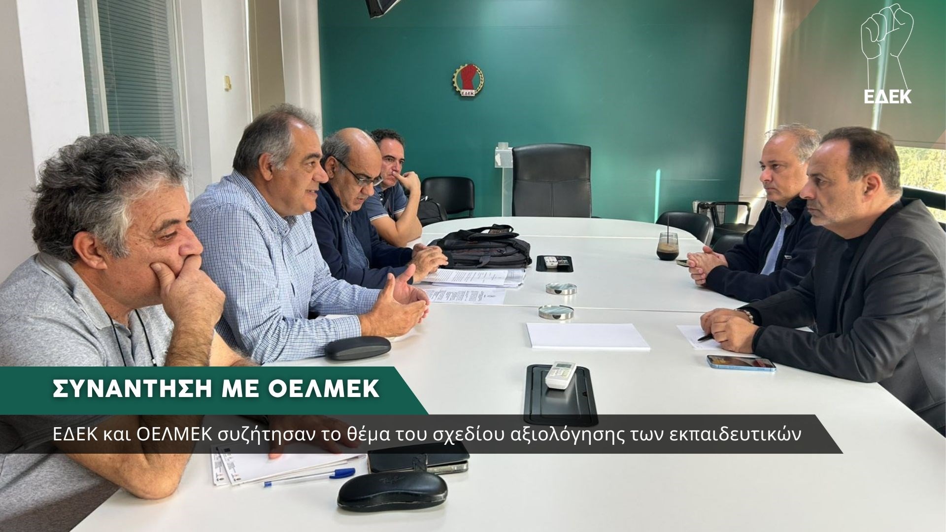 Οι απόψεις της οργάνωσης των εκπαιδευτικών Μέσης Εκπαίδευσης ΟΕΛΜΕΚ και οι θέσεις της ΕΔΕΚ για το προτεινόμενο από την κυβέρνηση νέο σύστημα αξιολόγησης των εκπαιδευτικών και τρόποι να μειωθεί το χάσμα που χωρίζει τις οργανώσεις εκπαιδευτικών και την κυβέρνηση, συζητήθηκαν σε συνάντηση αντιπροσωπείας της ΕΔΕΚ, υπό τον Αναπληρωτή Πρόεδρο, Μορφάκη Σολομωνίδη με αντιπροσωπεία της ΟΕΛΜΕΚ.