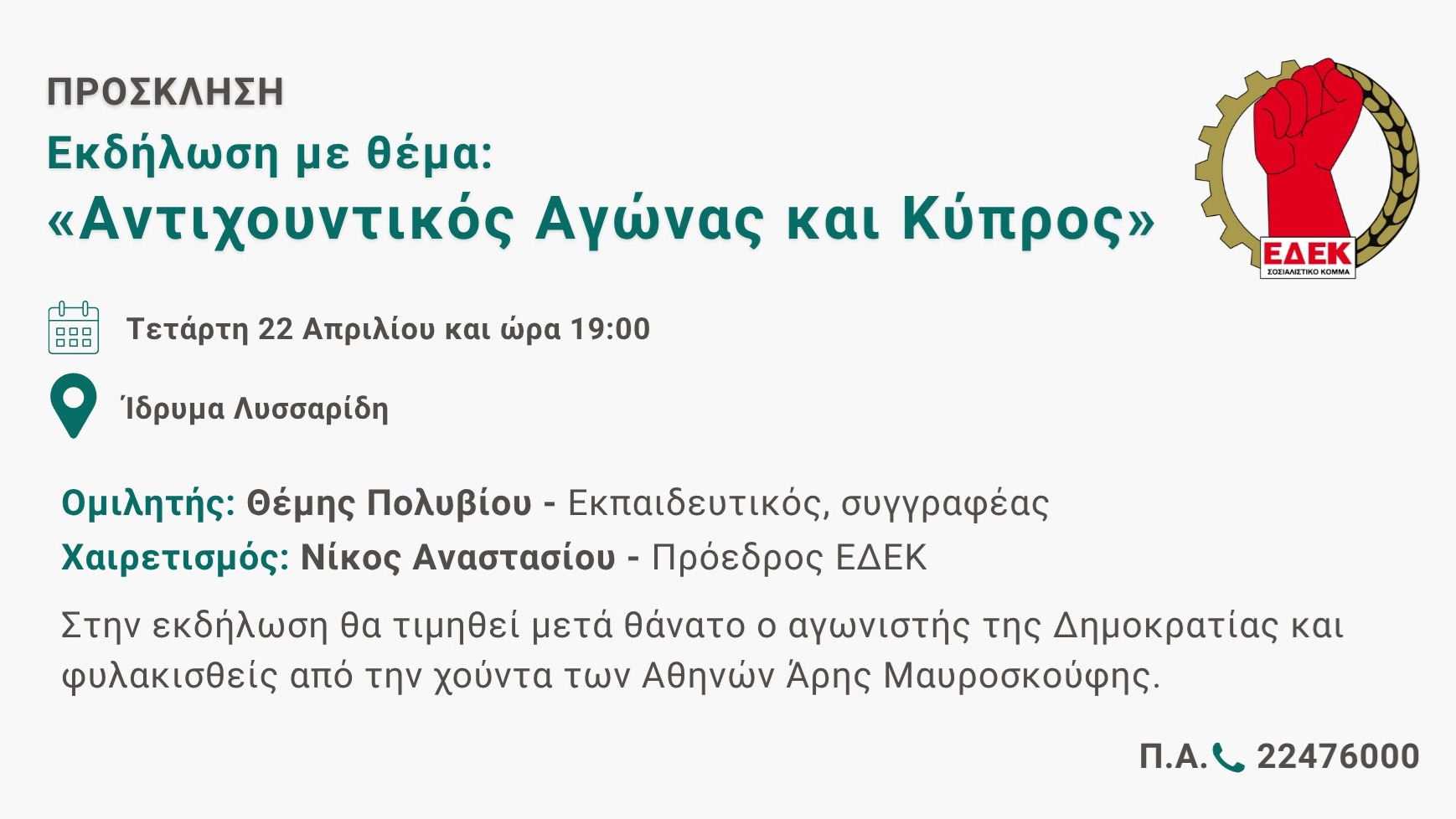 Στην εκδήλωση θα τιμηθεί μετά θάνατο ο αγωνιστής της Δημοκρατίας και φυλακισθείς από την χούντα των Αθηνών Άρης Μαυροσκούφης.